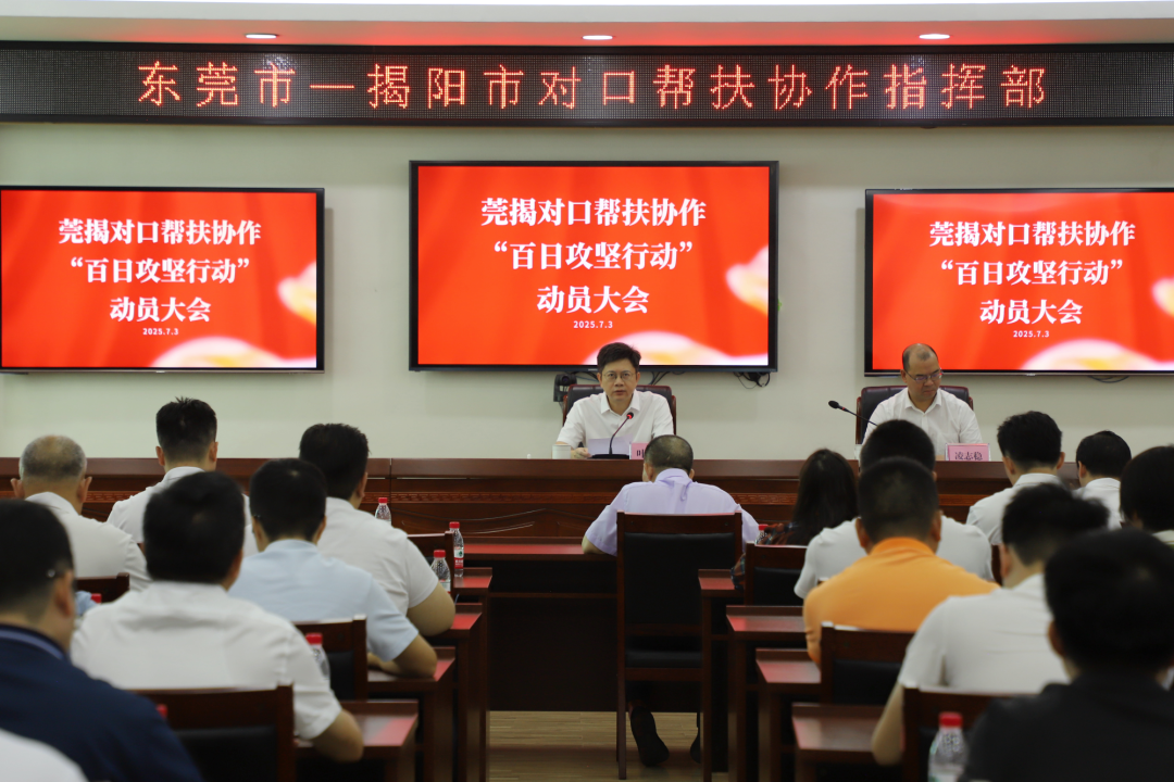 7月3日,莞揭对口帮扶协作“百日攻坚行动”动员大会召开,全面吹响下一阶段莞揭对口帮扶协作工作冲锋号,动员全体人员大干特干、集中攻坚,以饱满的精神状态奋力开创莞揭对口帮扶协作新局面。莞揭指挥部指挥长叶冠强出席会议并讲话。莞揭指挥部副指挥长凌志稳主持会议。