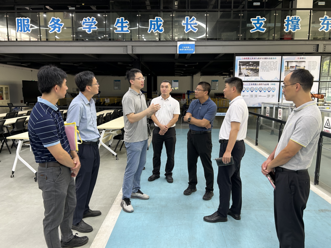 其间,在学院负责人陪同下,袁俊凯一行实地参观学院技能培训课堂、机器人实训中心等教学场地,详细了解学院在技能人才培养、实训体系建设、产教融合等领域的先进经验与实践成果。随后,调研了“麻惠人才反向飞地‘东莞职业技术学院培训基地’”挂牌选址。