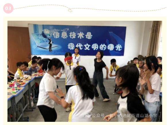 在山湖小学,老师们积极融入到班级的游戏中,和孩子们互动,为孩子们准备丰富的礼物,一同度过这欢快的时光。